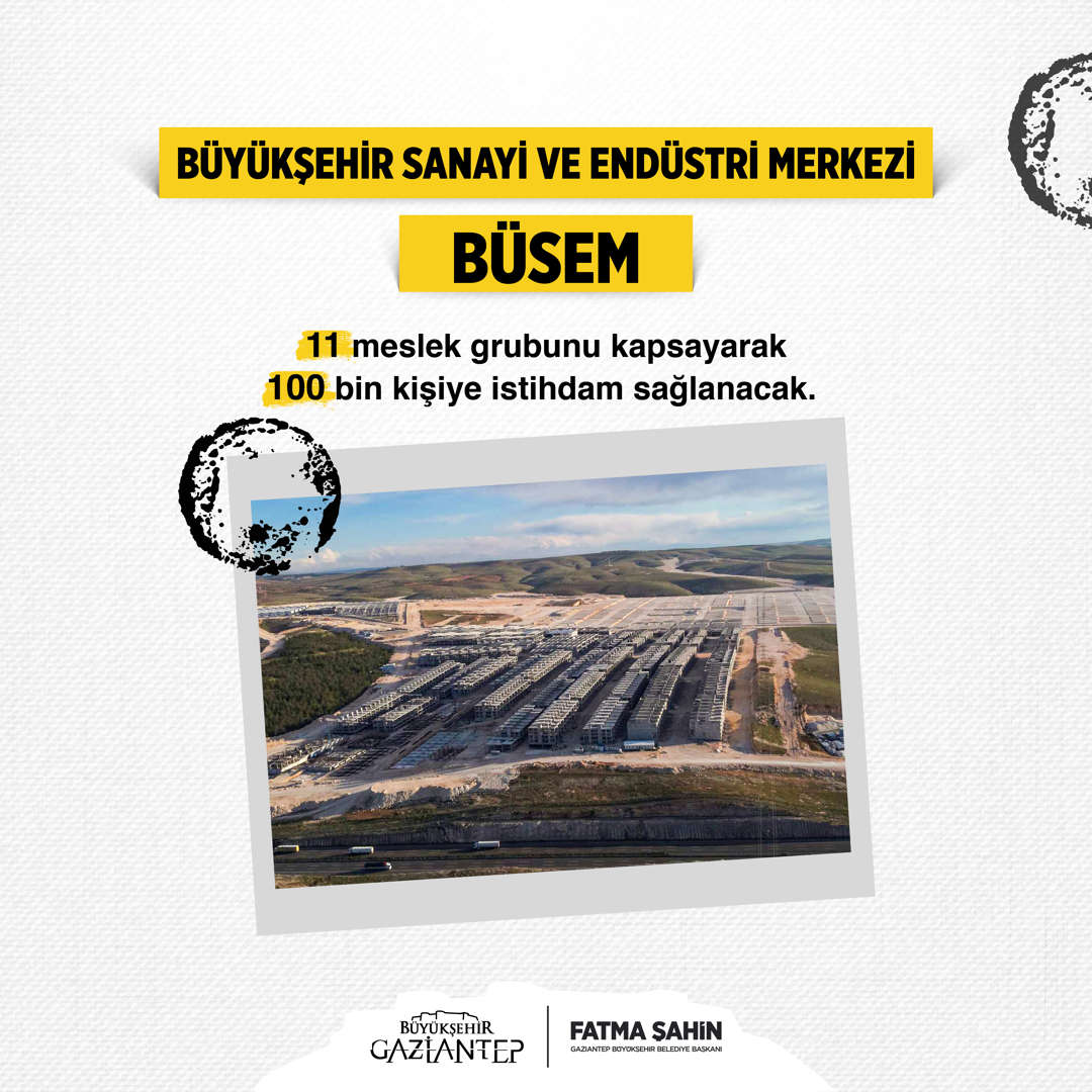 BÜSEM Gaziantep’in kalbi, aklı, nabzı, istihdam merkezi olacak. Sanayi şehri Gazi şehrimizde dağınık vaziyette üretim yapmak zorunda kalan bazı sektörleri, bir çatı altında toplamayı amaçlıyoruz. BÜSEM sayesinde güçlü sanayisiyle üretimde dünyada öncü şehrimizde fıstıkçılar, gıda toptancıları, nakliyeciler ve tır dorsecileri bir çatı altında olacak. Büyükşehir Sanayi ve Endüstri Merkezi (BÜSEM), sanayi kentinin yeni imajı olacak.